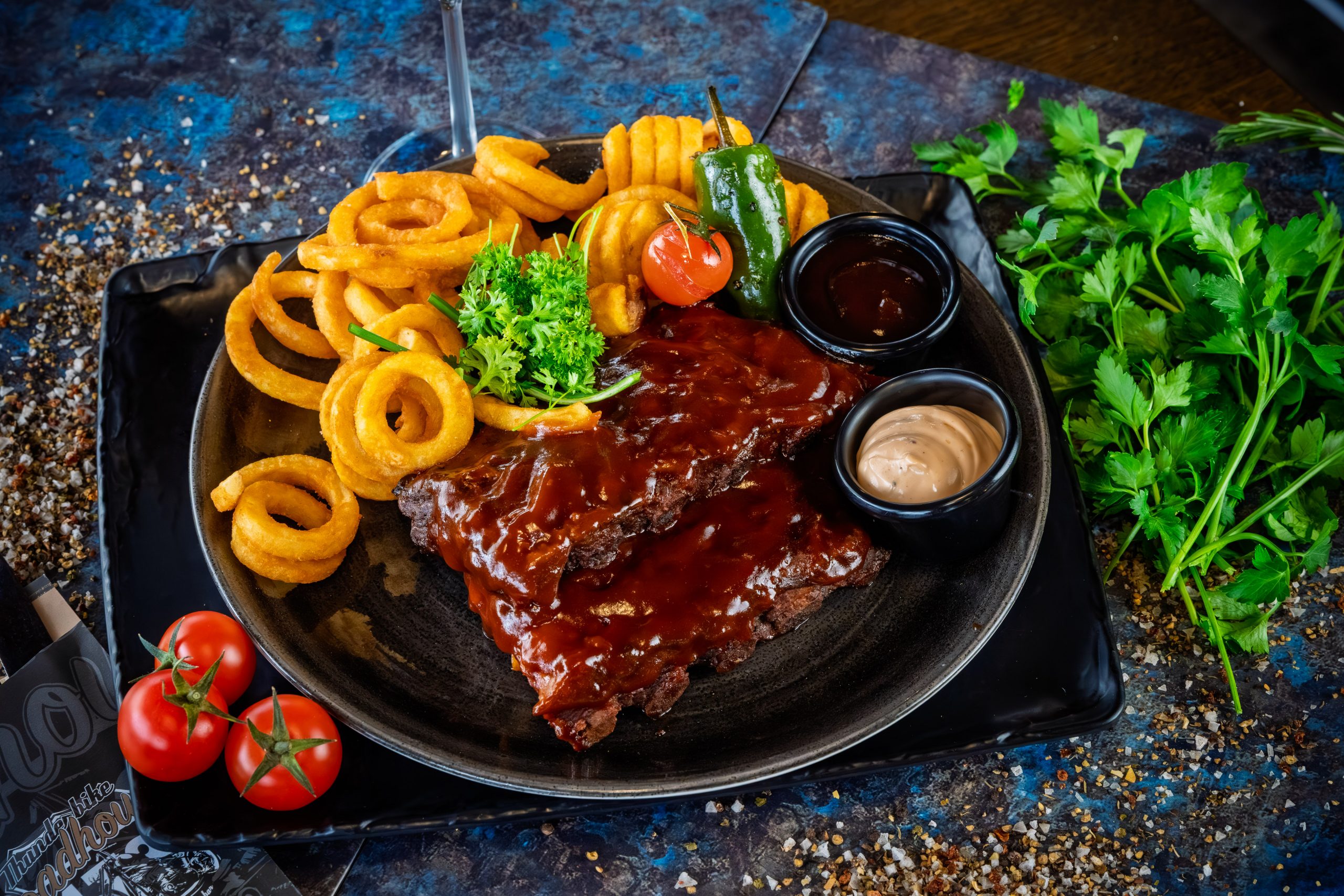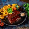 Chickenwings und Spare Ribs mit Amarena-BBQ-Sauce, Onion Rings und Sour Cream, dazu servieren wir Dir eine Beilage und einen Dip deiner Wahl